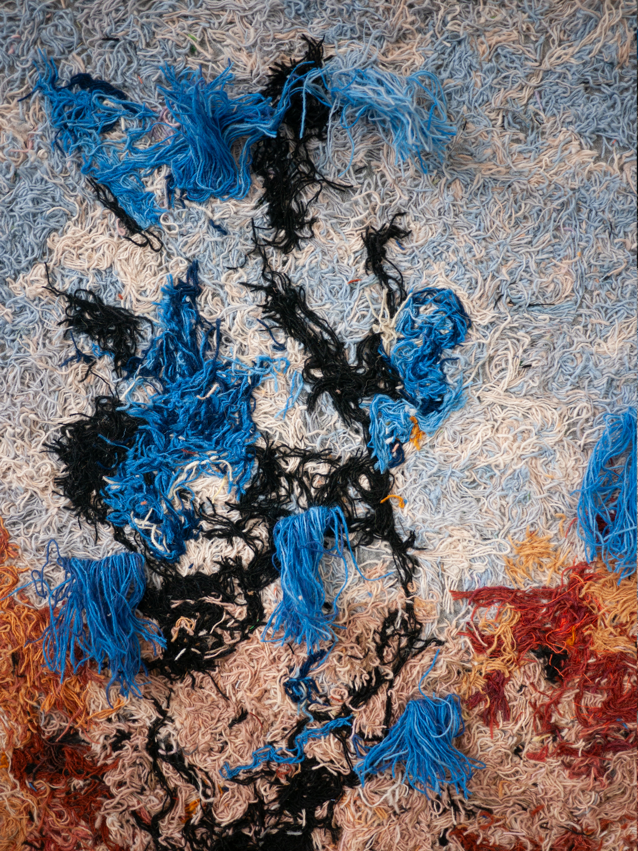 Made from leftover cut off yarns, a rest product from carpet making. Each strand placed, and attached with a barbed felting needle. Using the natural scales of the wool fibre to create a felt texture reminiscent of impressionist paintings.
